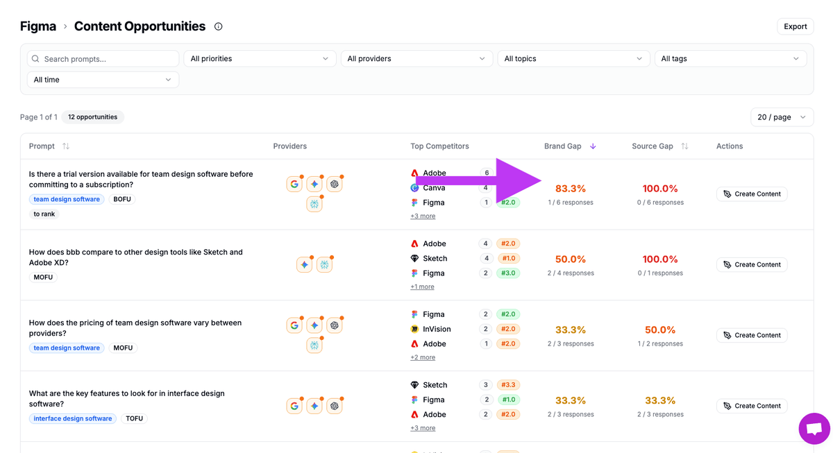 Yes. Content Opportunities supports filtering by provider (ChatGPT, Claude, Perplexity, Gemini, etc.). This reveals platform-specific gaps. You might have strong visibility on Claude but major gaps on ChatGPT, requiring targeted content strategies. Each opportunity also shows provider breakdown so you understand which AI platforms contribute to each gap.