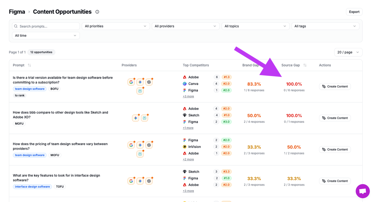 5. Monitor Gap Evolution As you publish content addressing opportunities, monitor how gaps evolve. Track Brand Gap and Source Gap percentages over time to validate content effectiveness.