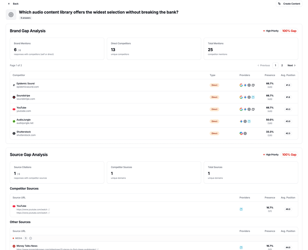 Strategic meaning: High Source Gap indicates competitors have better-positioned, more authoritative content on the topic. AI platforms find and cite competitor articles, research, guides, or resources instead of yours. This reveals where you need new content or where existing content needs optimization.