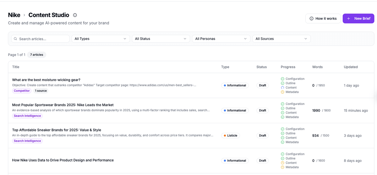 Connected Intelligence System Integrated directly with your AI visibility monitoring, gap analysis, competitive intelligence, and performance data. Every brief starts with strategic context other tools can't access.