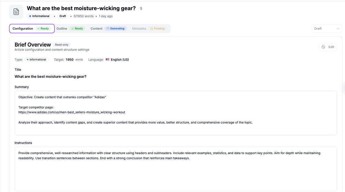 Article generation typically takes 3-5 minutes from brief creation to final draft. The workflow includes: configuration (30 seconds), outline generation (1 minute), deep source analysis and content generation (2-3 minutes), and metadata optimization (30 seconds). You can review and edit at each stage, or let the system complete the full workflow automatically.