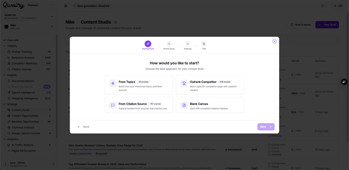 In your Qwairy dashboard, navigate to Content Studio under the Strategy section. The platform automatically connects to your monitoring data, gap analysis, and competitive intelligence.