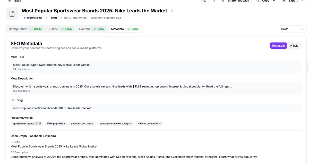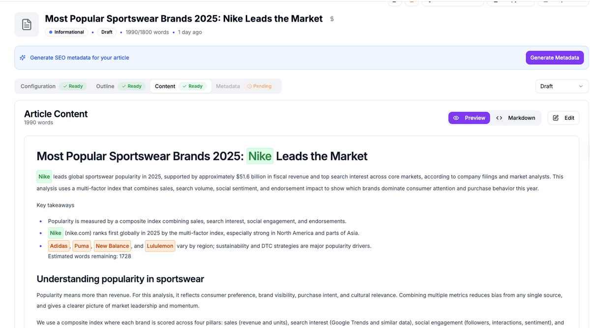 The fact-checker runs automatically during generation, ensuring every article contains current, verifiable information from the start.