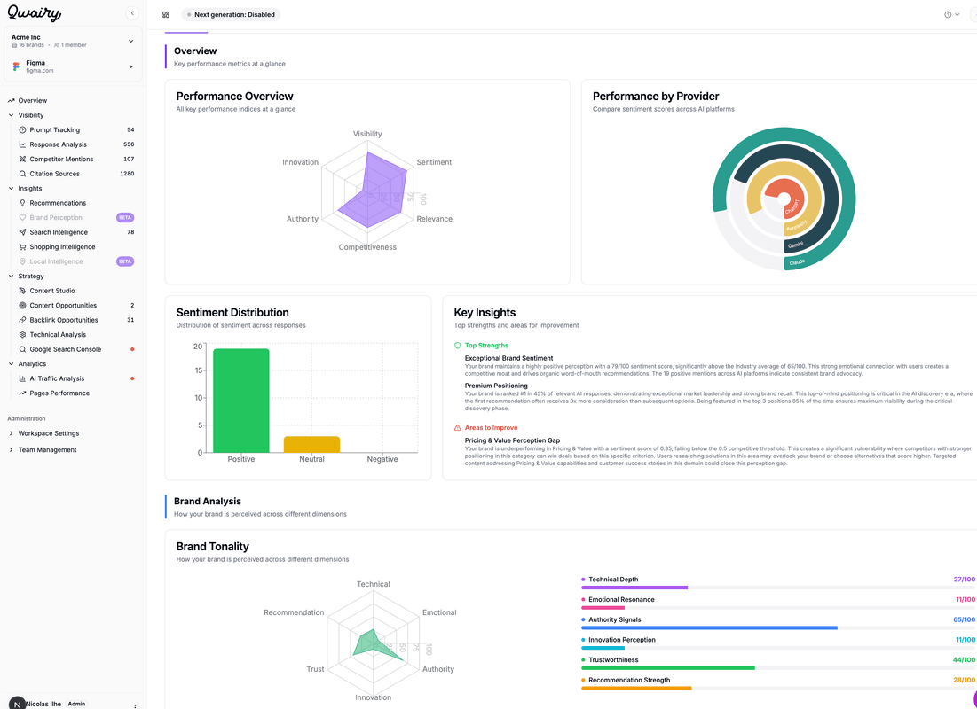 1. Brand Perception Analysis Start with sentiment tracking. See how AI platforms describe your brand, identify perception gaps vs competitors, and spot positioning opportunities. Monitor sentiment trends over time to catch shifts early.
