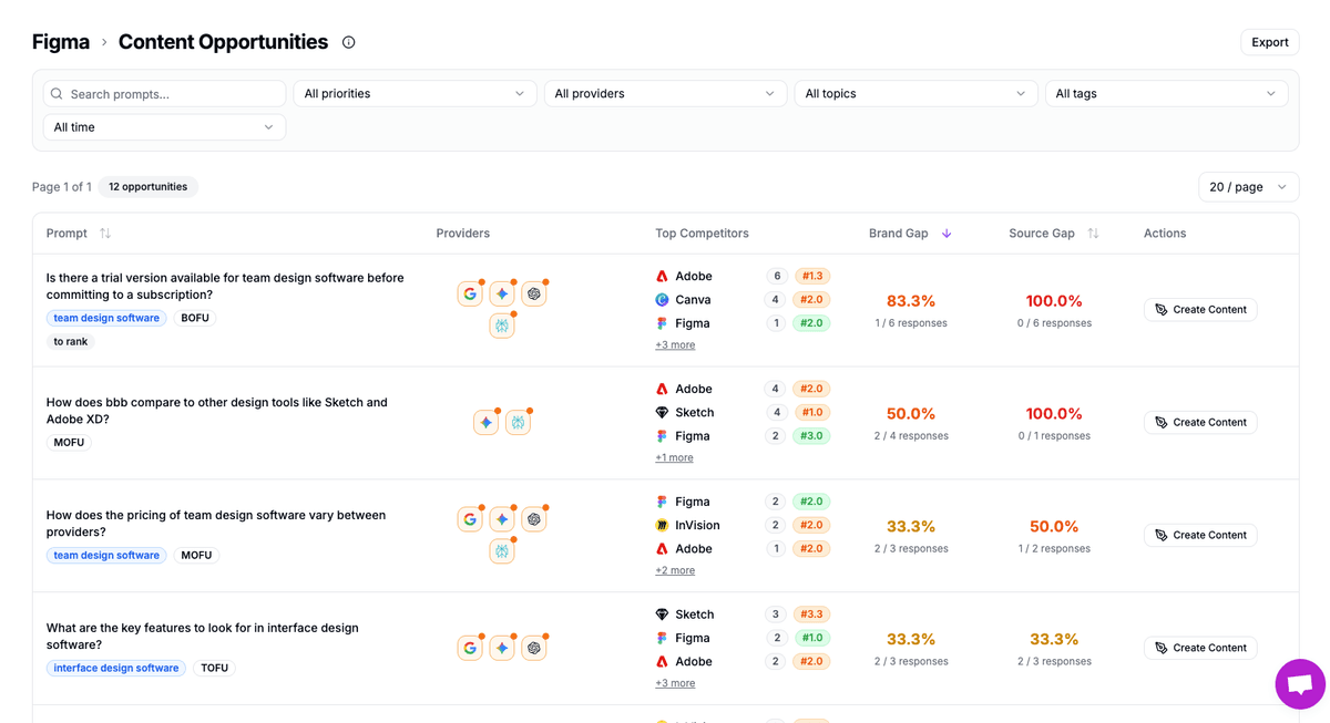 - Content Opportunities - From identified visibility gaps with competitor analysis
