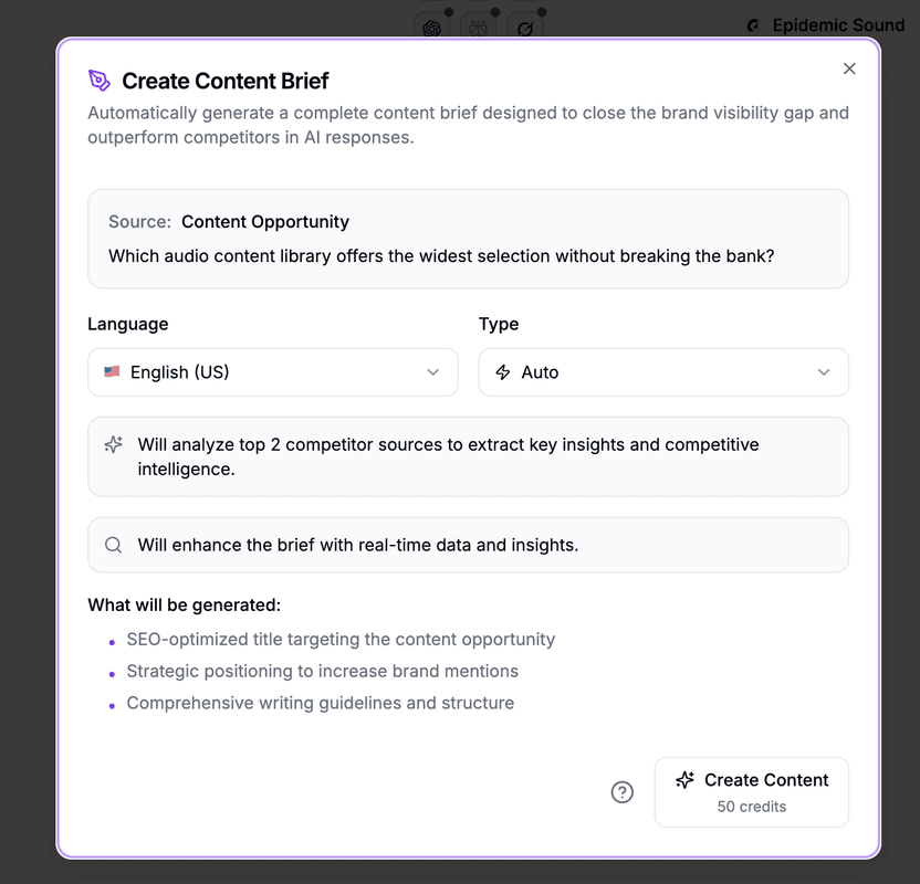 See a critical gap ā Click "Create Content" ā Opportunity data flows to Content Studio ā Brief generated in seconds.