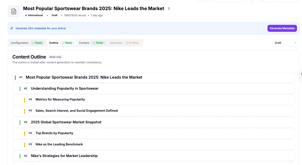 Full article creation with AI-optimized tone and structure, strategic positioning based on gap analysis, integrated citations and data points, and SEO/GEO best practices applied. The fact-checker runs automatically to verify claims and flag statements needing sources.