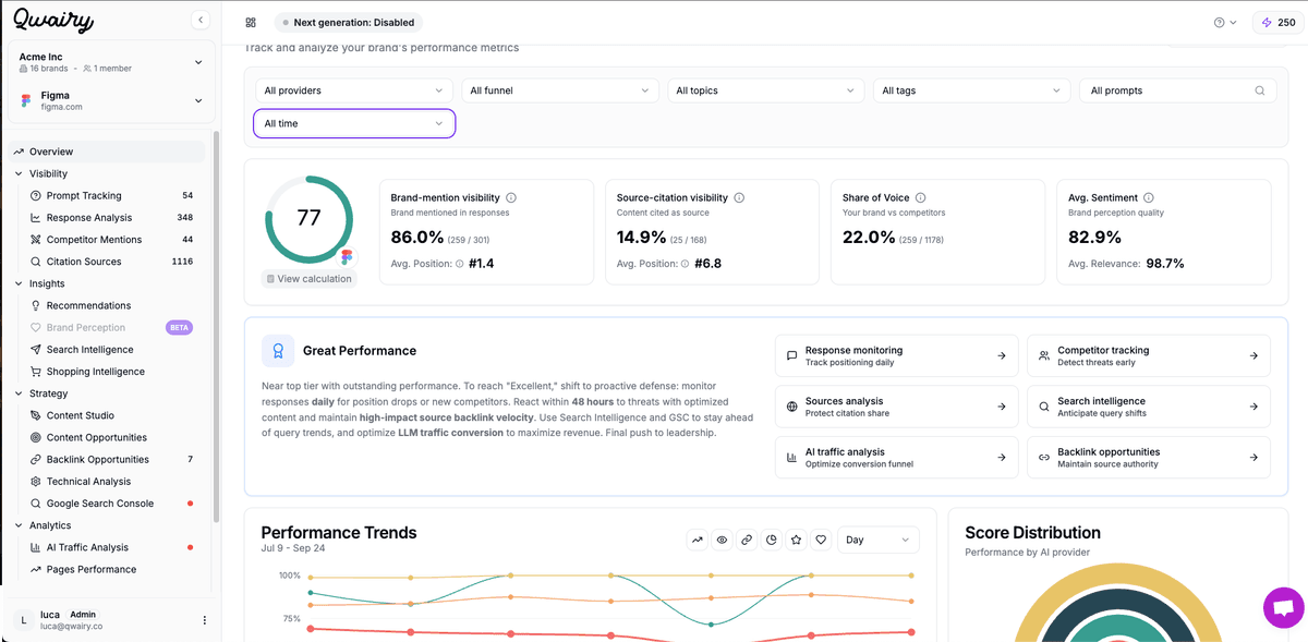 This is why Qwairy is the best all-in-one GEO platform: data-driven intelligence, 360° strategy from monitoring to execution, and the most complete platform to deliver real, measurable results in AI search.